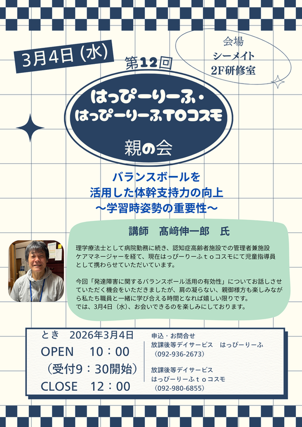 こんにちは!はっぴーりーふtoコスモです!本日は第12回親の会開催のお知らせになります!3月4日(水...