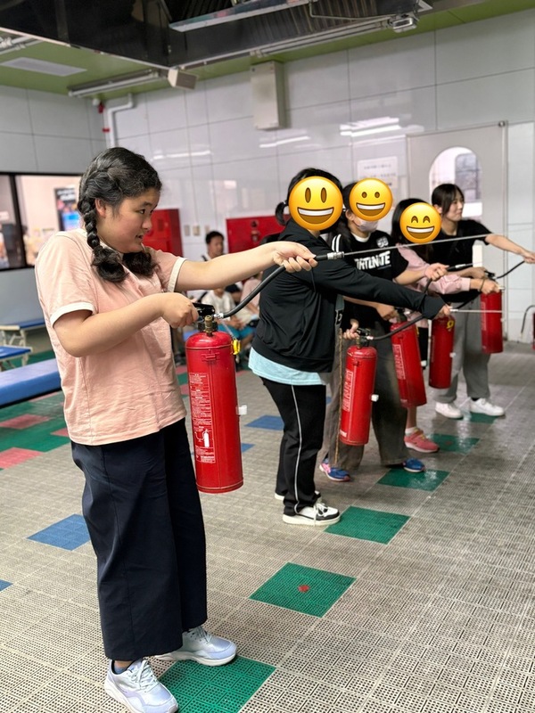 煙体験につづき消火器の使い方へ。ちゃんと説明通りにじょうずに使うことが出来ていました。